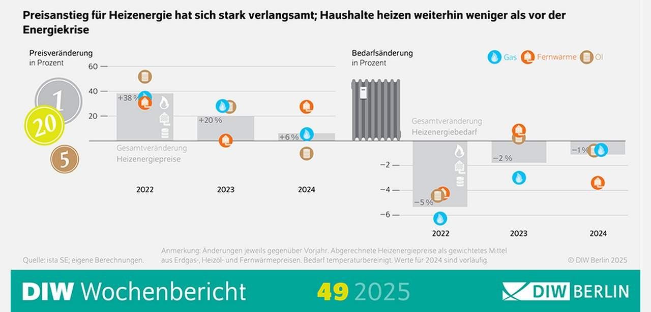Die jüngsten Daten von ISTA und DIW zeigen, dass die Heizenergiepreise im Jahr 2024 nur noch um rund sechs Prozent zunahmen. Im Vorjahr lag die Rate mit etwa 20 Prozent deutlich höher, 2022 erreichte sie sogar 38 Prozent. Der gewichtete Durchschnittspreis für Gas, Öl und Fernwärme veranschaulicht diese Verlangsamung. Die Berechnungen stützen sich auf Abrechnungsunterlagen zahlreicher Mehrfamilienhäuser sowie interne Analysen des Deutschen Instituts für Wirtschaftsforschung. Dadurch wird eine abgeschwächte Teuerung im Wärmesektor im Vergleich zu den Vorjahren unterstrichen.
